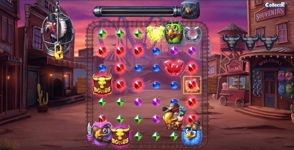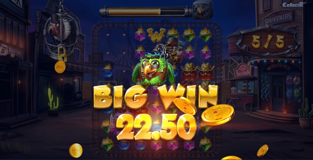 The Bandit Escape feature adds an element of thrill to the game. This feature is triggered by collecting keys, activating the bandit’s escape. The bandit appears on the game grid, collecting symbols as he moves. He engages in duels with the birds until he is defeated. This feature can result in significant symbol collections, boosting the player’s chances of winning big.